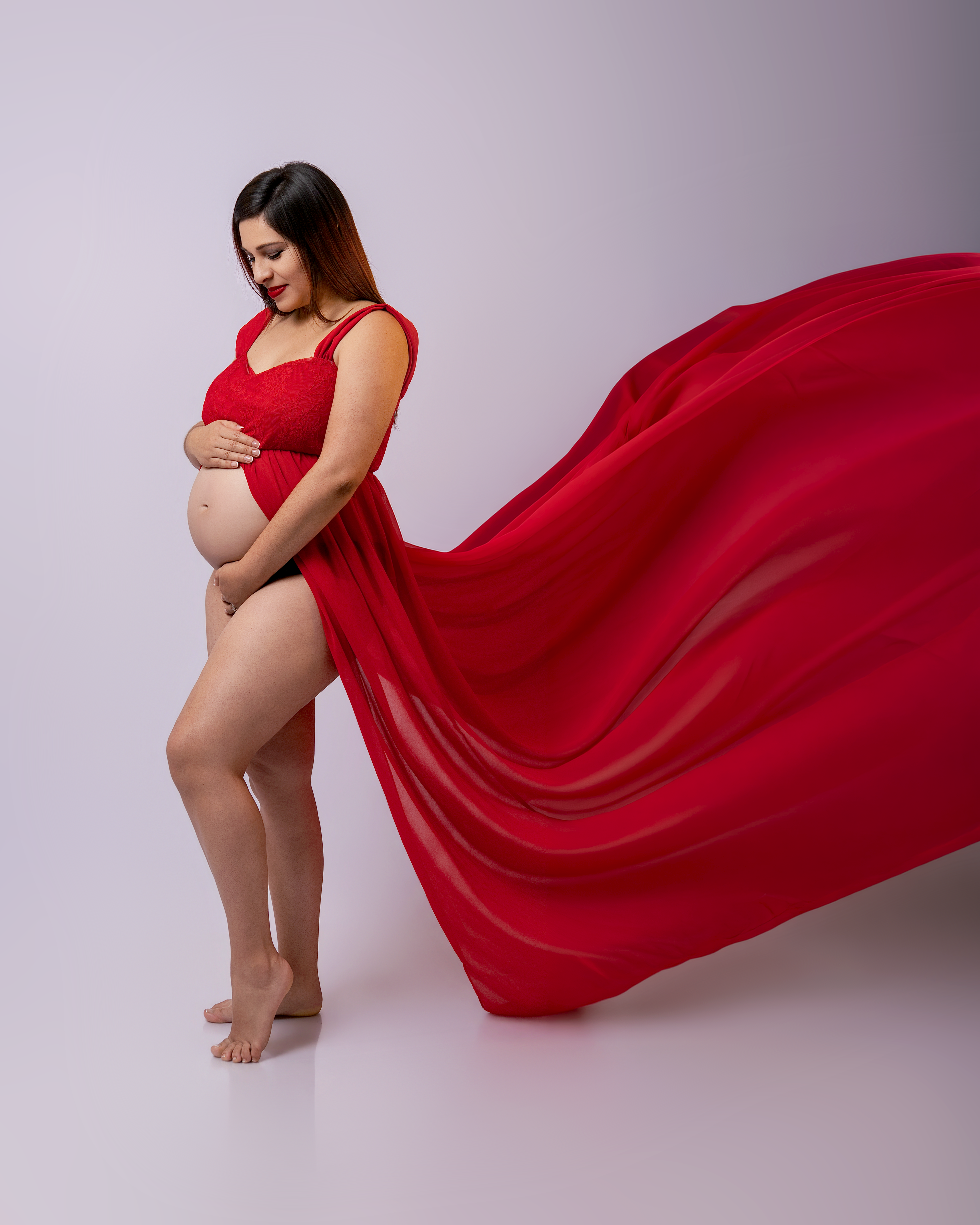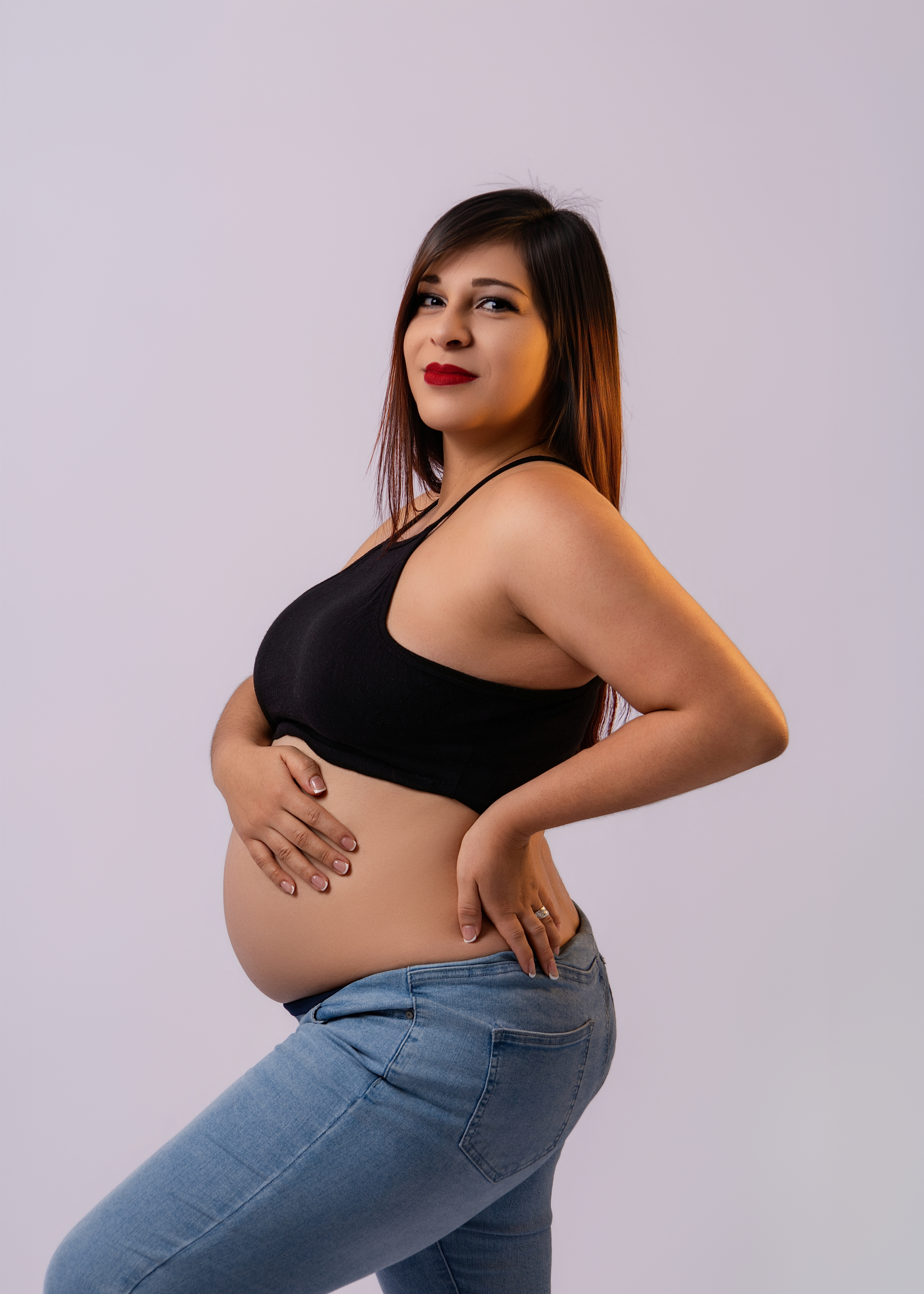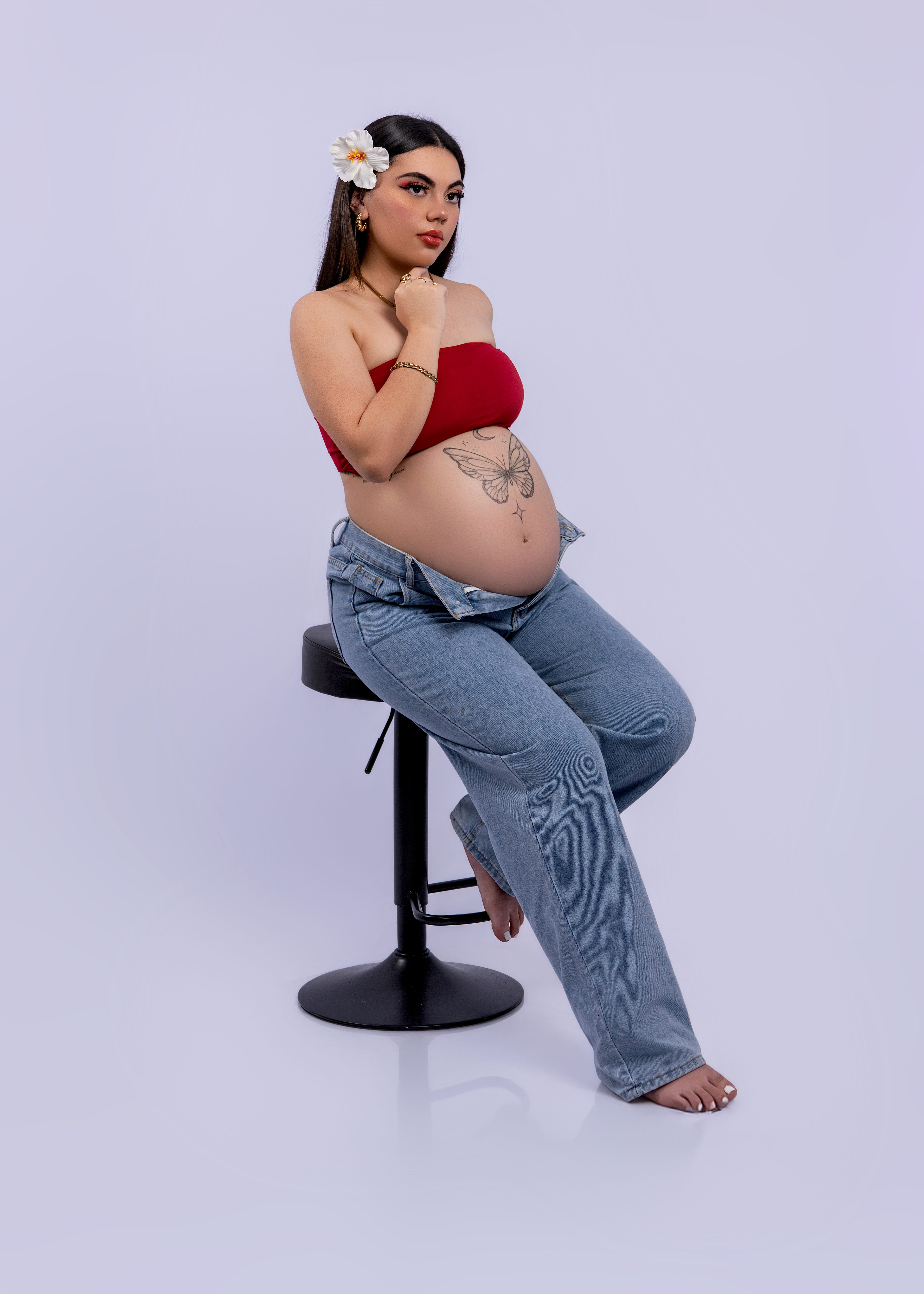 Este enfoque minimalista resulta especialmente efectivo en los retratos de maternidad, donde las composiciones se construyen a partir de fondos sólidos en diversos colores.