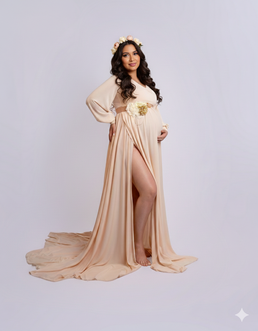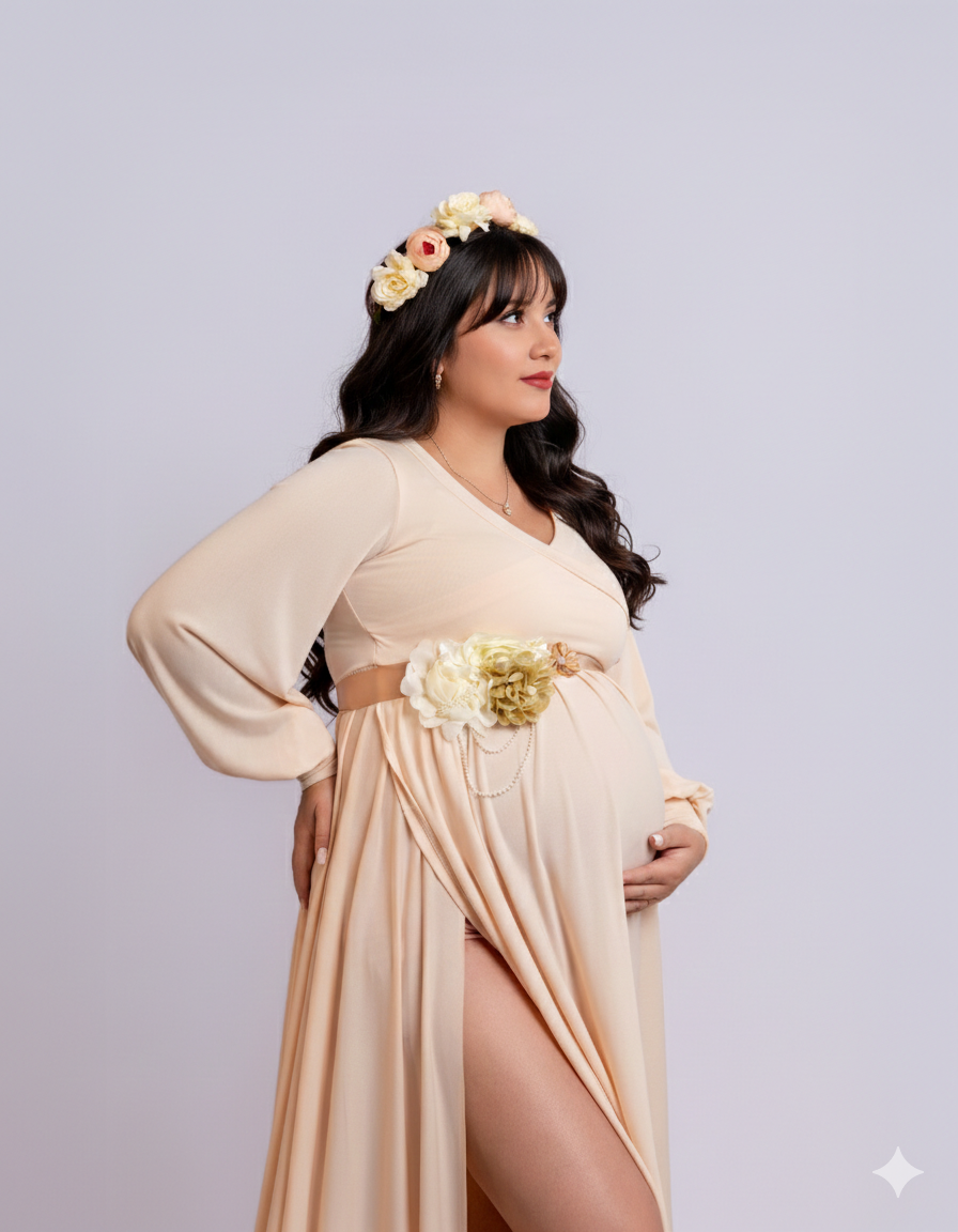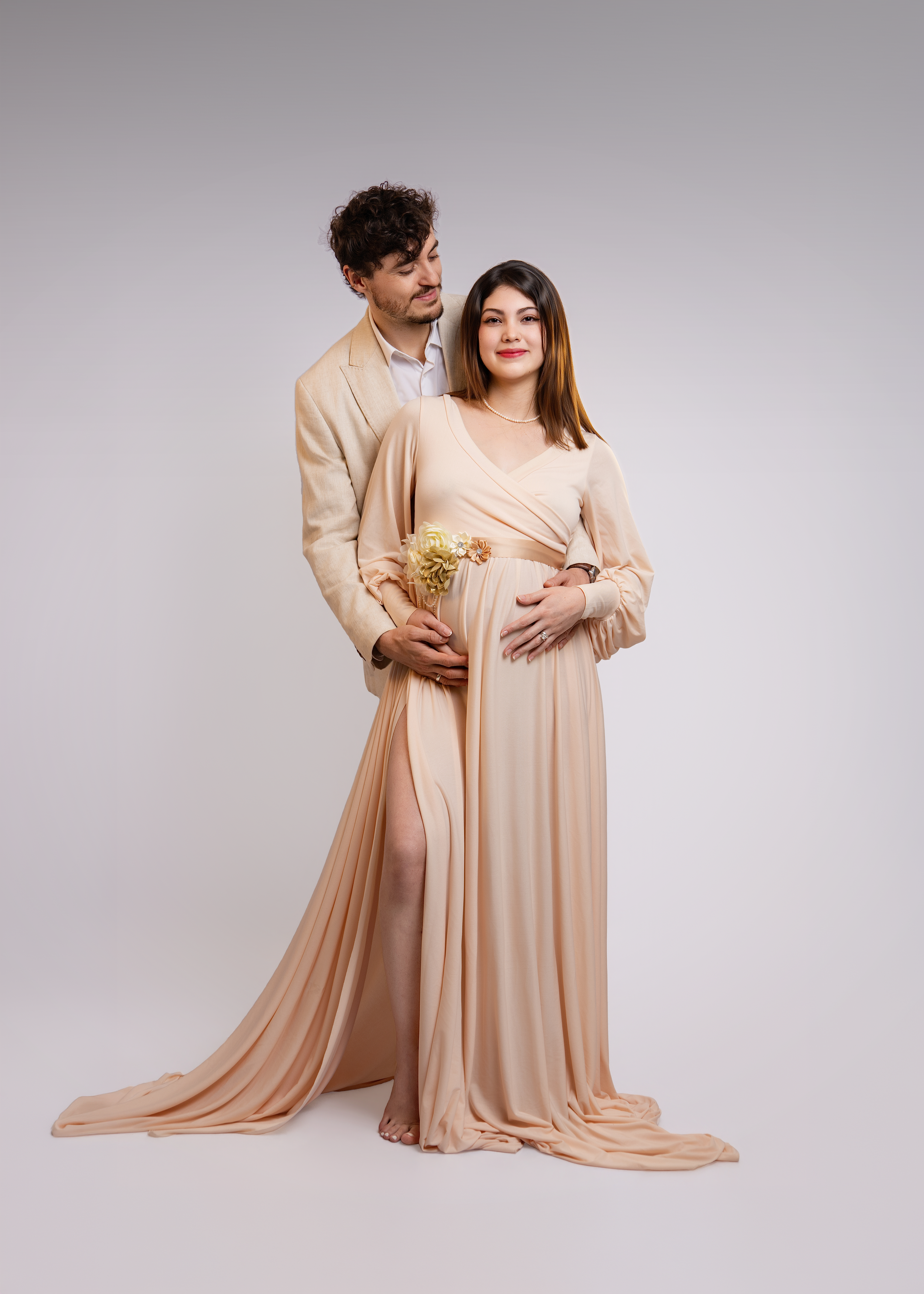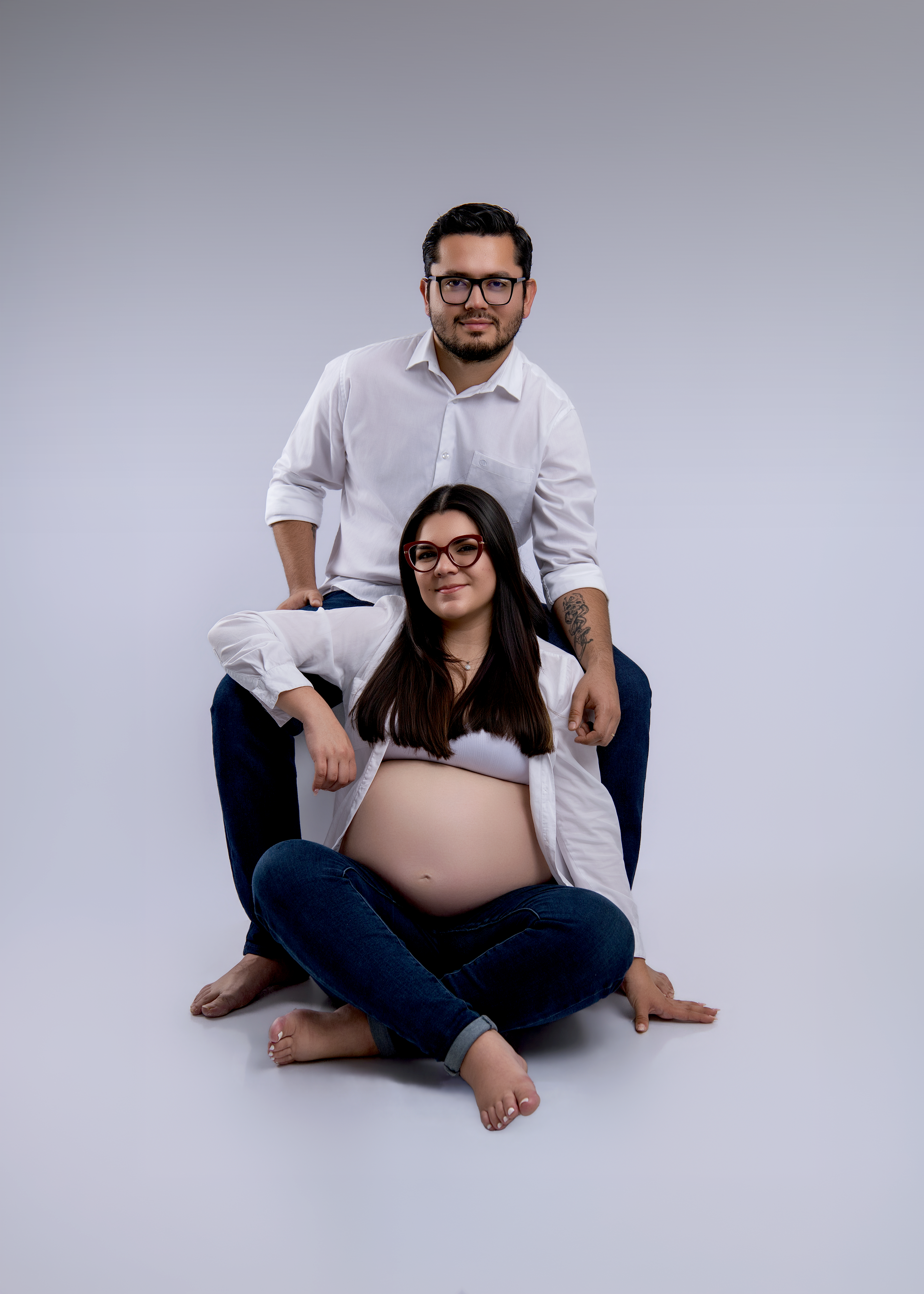 Este enfoque minimalista resulta especialmente efectivo en los retratos de maternidad, donde las composiciones se construyen a partir de fondos sólidos en diversos colores.
